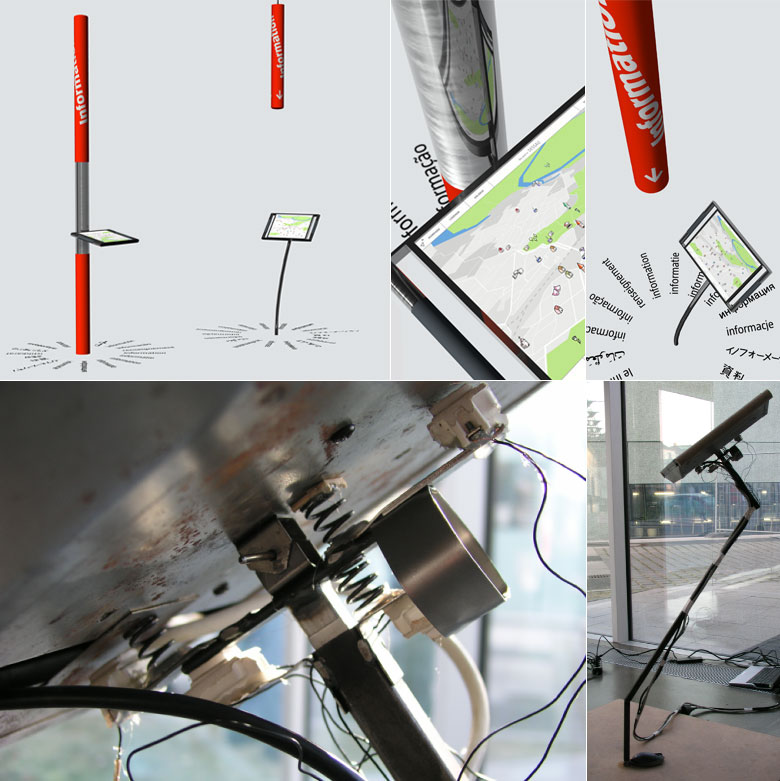 Important parts of my diploma project „eva“ were two terminals. As kind of augmented reality, they could map information from the Internet virtually onto the surroundings. Rotating or tilting allowed to navigate through the virtual environment. The lower two pictures showed the functional mock-up.
